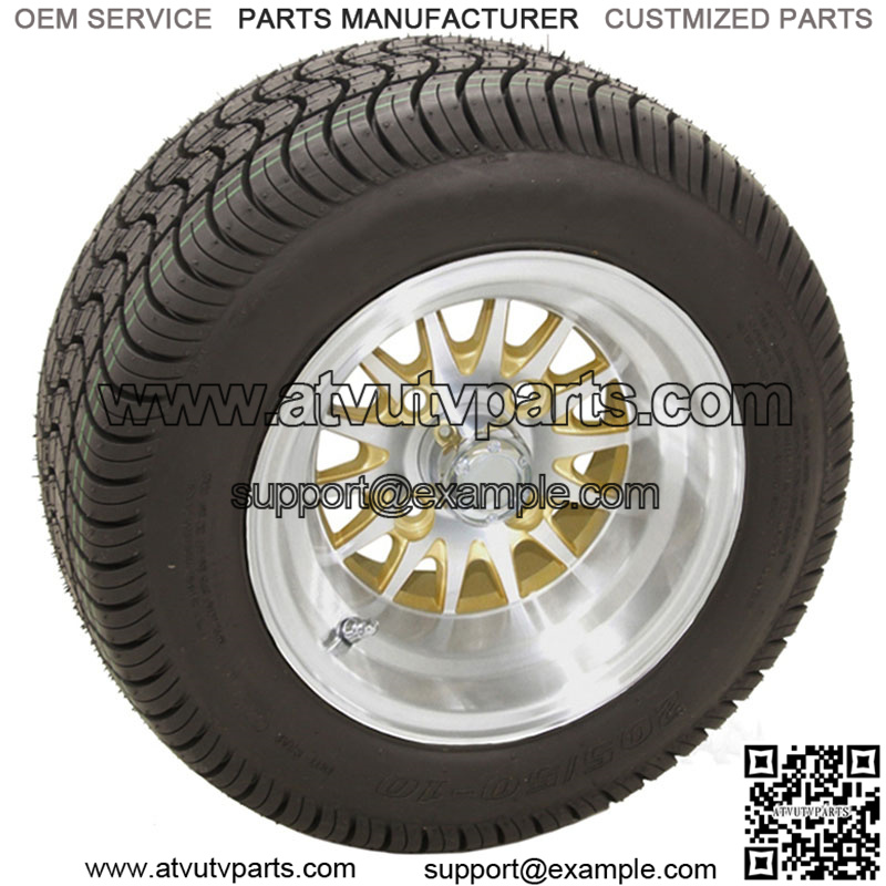 10” Machined with Gold Wheels on your choice of Street Low Profile Tires Details: Set of 4 mounted golf cart tire and wheel assemblies 16 Chrome Lug Nuts 4 Center Caps Machined with Gold Wheels 10×7 with 4×4 bolt pattern This combo will NOT require a lifted cart Tire Options: – Select from the list of Low Profile Tires below *Please select Standard (and Club Car) or Metric (Yamaha) Lug Nuts*