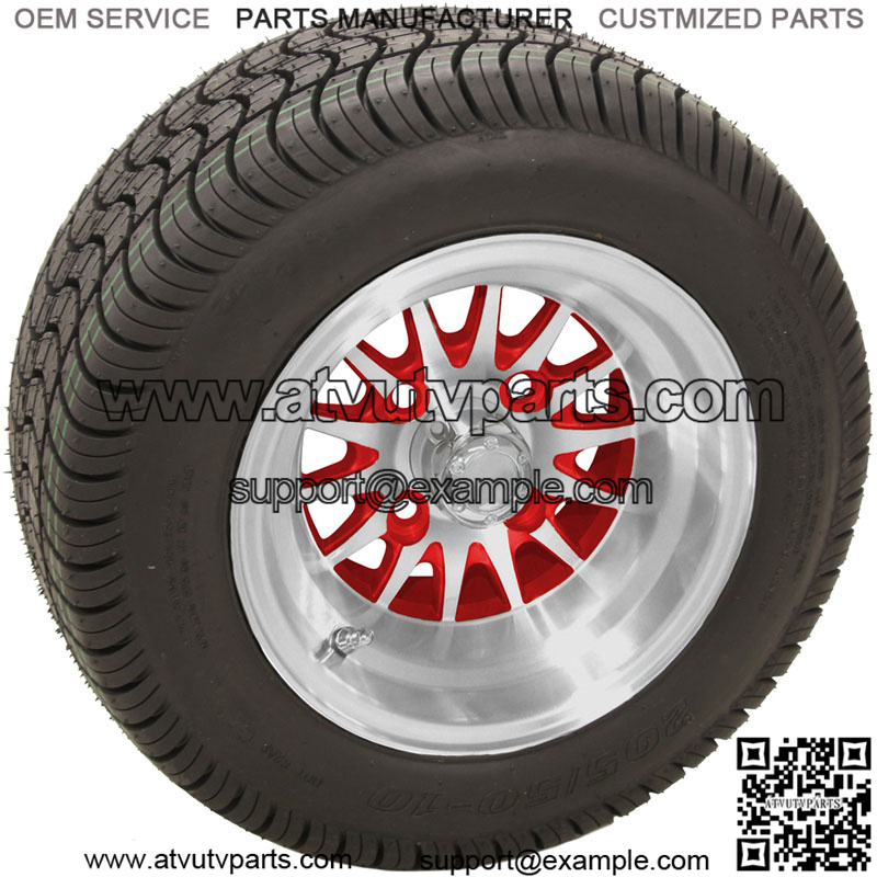 10” Machined Red Wheels on your choice of Street Low Profile Tires Details: Set of 4 mounted golf cart tire and wheel assemblies 16 Chrome Lug Nuts 4 Center Caps Machined Red Wheels 10×7 with 4×4 bolt pattern and ET-15.5 offset This combo will NOT require a lifted cart Tire Options: – Select from the list of Low Profile Tires below *Please select Standard (and Club Car) or Metric (Yamaha) Lug Nuts*