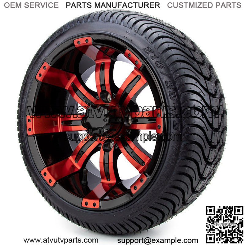 12″ Red and Black – Tires and Wheels Combo Details: Set of 4 mounted golf cart tires and wheel assemblies Optional Lug Nuts – Black 4 Center Caps Red and Black Wheels 12×7 with 4×4 bolt pattern ET -25 offset Tire Options: (Not Sure What Fits Check out our Tire Guide) 215/35-12 Arisun Cruze 215/50-12 Arisun Cruze 245/50-12 Street Fox Radial