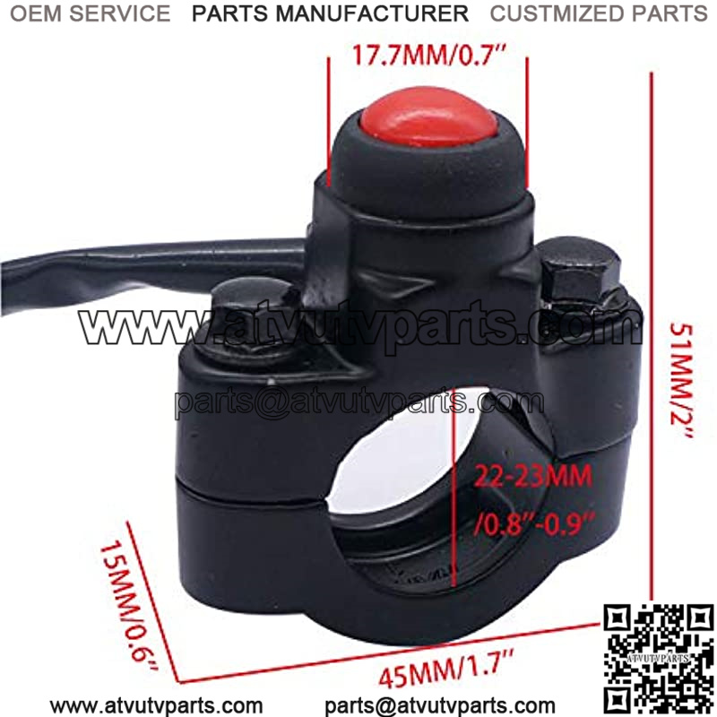 Switch Size(Approx): 51x45x15MM/2”x1.7”x0.6”Wire Length: 20.08inch/ 55cm;Install diameter: 22MM-23MM;could be used on DC 12V electrical system.