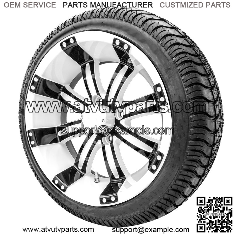 14″ Black White SS Wheels on Street Low Profile Tires Details: Price is for a set of 4 mounted golf cart tires and wheel assemblies 16 Black Lug Nuts 4 Center Caps Black White SS Wheels 14X7 with 4X4 bolt pattern This combo does NOT require a lifted cart *Some Club Car and Yamaha models MIGHT have some rubbing and could require slight modifications to fit* Tire Options: Arisun 14″ 205/30-14 Low Pro Tire