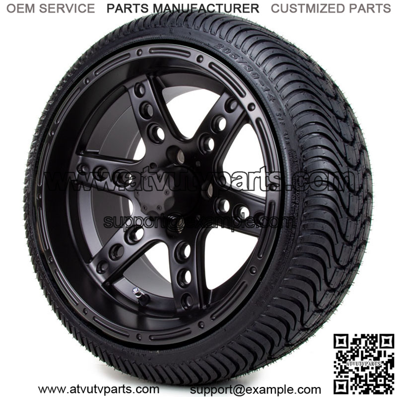 14″ Matte Black – Low Profile Tires and Wheels Combo Details: Set of 4 mounted golf cart tires and wheel assemblies Optional Lug Nuts – Black 4 Center Caps Matte Black Wheels 14×7 with 4×4 bolt pattern ET -25 offset Tire Options: (Not Sure What Fits Check out our Tire Guide) 205/30-14 Arisun Cruze 205/30-14 Guardian 205/40-14 Street Fox Radial