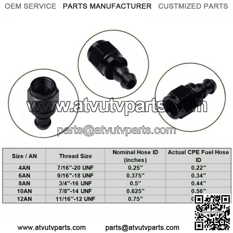 6AN adapter size male with anodized barb push-on hose fittings.