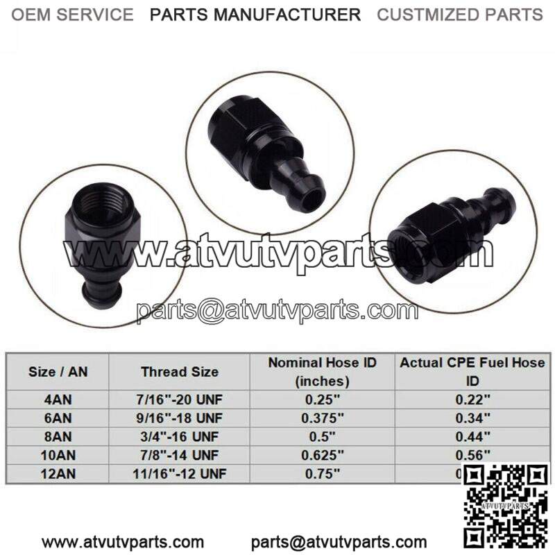 10AN adapter size male with anodized barb push-on hose fittings.