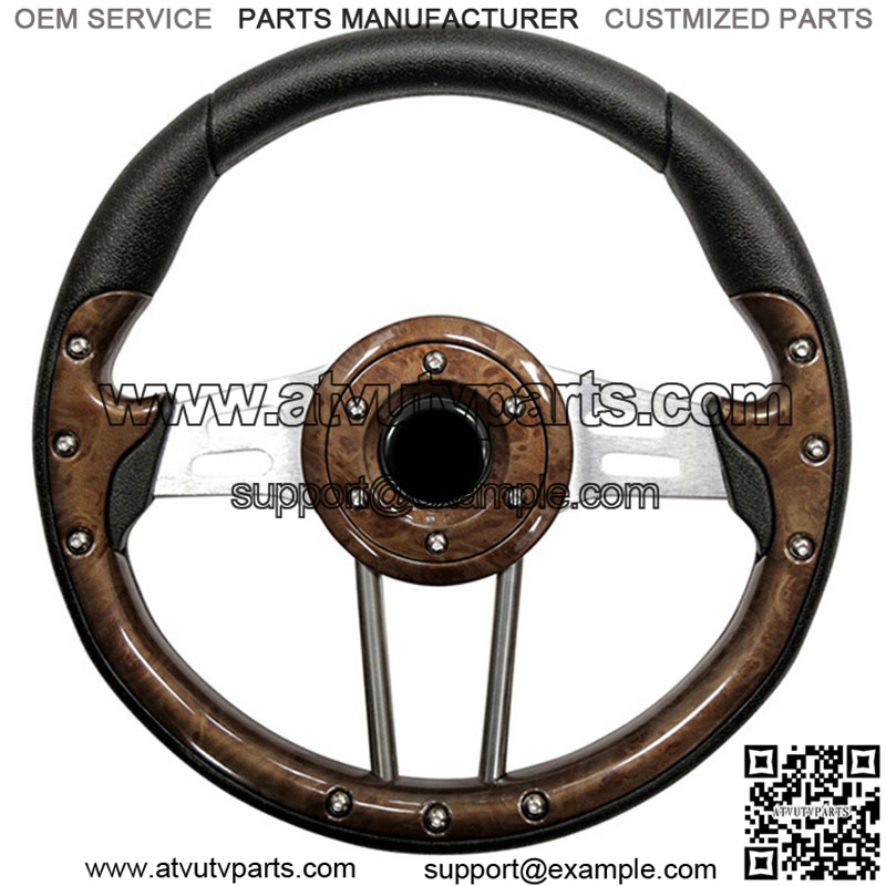 13″ Diameter Custom Steering Wheel. Style: 4. Color: Woodgrain Grip with Brushed Aluminum Spokes. Easy installation on E-Z-Go, Club Car and Yamaha with Custom Adapter (sold separately). Horn button is for aesthetic purposes only. Add a Chrome Adapter (Optional – $25)