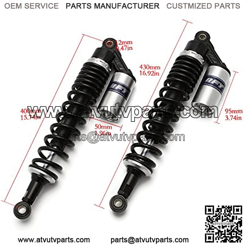 DescriptionMaterial: Solid Steel+Aluminium Alloy. Total Length: 430mm (17 inch). Eye To Eye Center Length: 400mm (15.75 inch). Spring thickness: 8 mm (0.31 inch) Max loading:300kg/pair 660lb/pair. The shock absorber is a modified universal type, compatible with most 50cc, 75cc, 90cc, 125cc, 150cc, 250cc, 300cc street cars, off-road vehicles, karts, ATVs, motorcycles and quad bikes.Universal fit for most vehicles, like CBR600RR CBR1000RR CB500 YZF-R1 YZF-R6 YZF-125 XC EXC XCF R800GS R1200GS, etc.