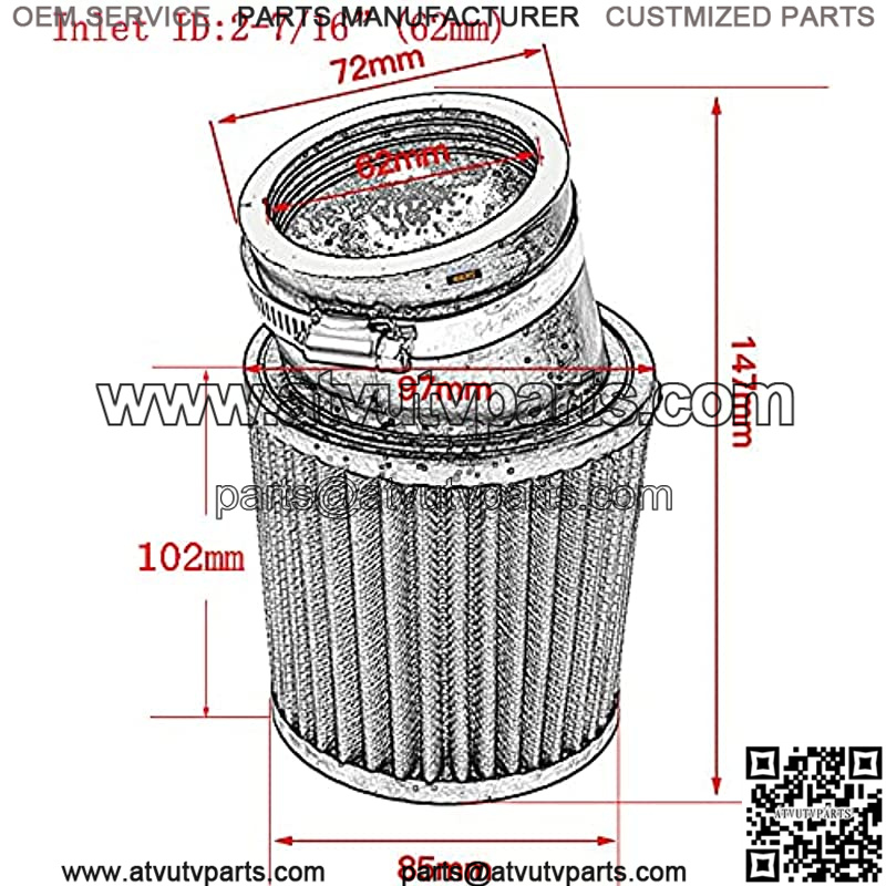 Size:Filter is 4″ Length x 3 1/2″ OD with 2 7/16″ ID to fit many aftermarket air filter adapters on the market.Overall Diameter at Widest Point: 95 mm=3.74″,Overall Diameter at Top: 85 mm=3.35″,Rubber Intake Inner Diameter: 62 mm=2.45″,Rubber Intake Outer Diameter: 74 mm=2.91, Overall Height: 147mm=5.79″