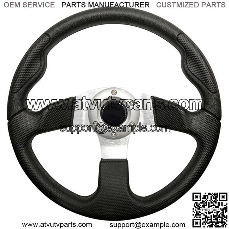 13″ Diameter Custom Steering Wheel. Style: . Color: Black Grip with Brushed Aluminum Spokes. Easy installation on E-Z-Go, Club Car and Yamaha with Custom Adapter (sold separately). Horn button is for aesthetic purposes only. Add a Chrome Adapter (Optional – $25)