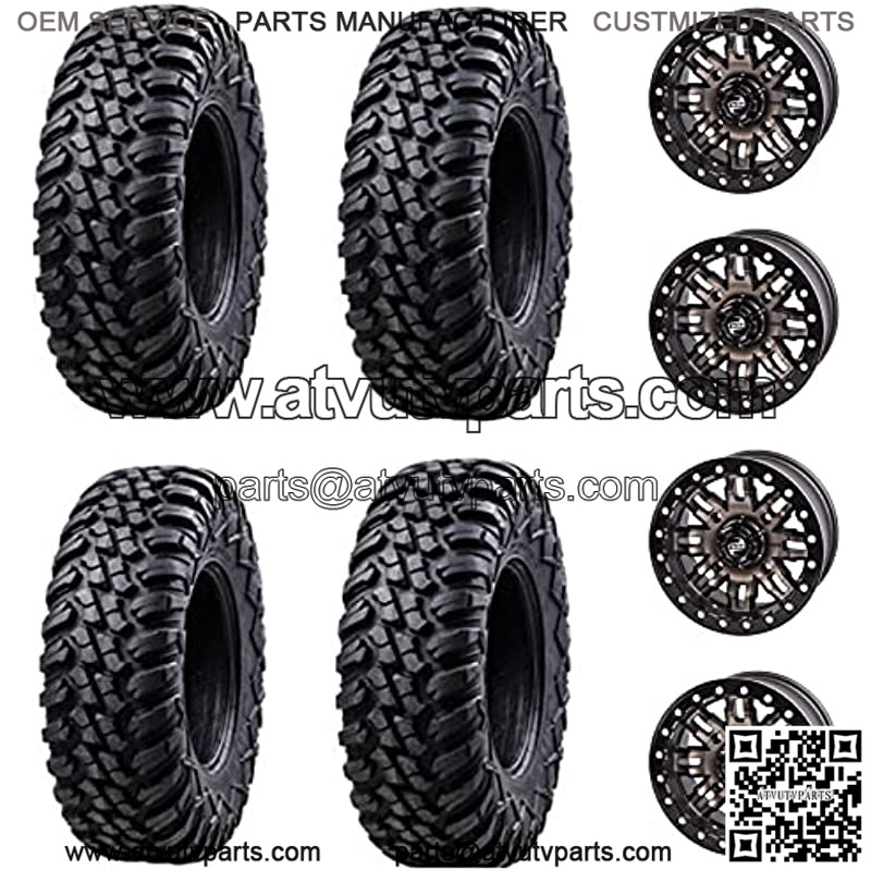 The tire is the ultimate all-terrain tire for your UTV or ATV. The truck style tread pattern and premium rubber compound provides excellent multi-surface performance and high mileage wear. Aggressive shoulder and sidewall tread add protection, and bite in dirt, sand, and rocks. A smooth ride and great off road traction make the Terrabite a complete package for all-terrain performance. The Tusk TETON Wheel is a rugged beadlock design. Cast aluminum wheel with a forged aluminum beadlock ring for light weight, and maximum strength. Bigger and stronger 5/16″ Grade 8 beadlock bolts.1200 lb load rating for durability. Screw on center cap included.Oversize lug holes fit common 17mm sockets. Please Note: The Terrabite can run slightly small for its size.