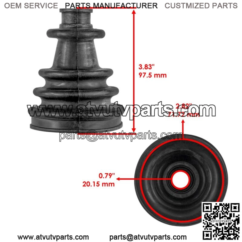 1x Front Axle Inner CV Boot Kit : 3236163Height : 97.5 mm | 3.83 “Inner Diameter : 20.15 mm | 0.79 “Outer Diameter : 71.72 mm | 2.82 ”