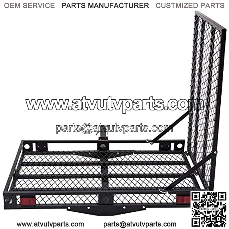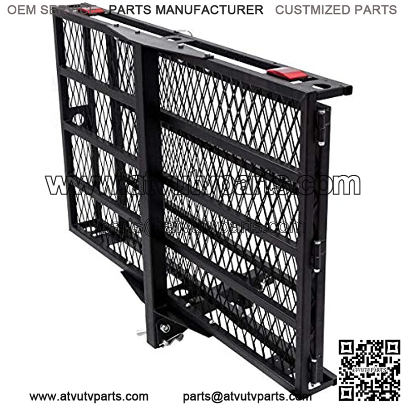 This is our high-quality wheelchair carrier. The max loading capacity of this wheelchair carrier is 500lbs and it has a platform to hold your wheelchairs and scooters. This carrier is made for cars, trucks, SUVs, or vans.Made of steel, this carrier is very durable. This carrier features an integrated ramp which can fold up and out into 3 different positions. The first position keeps the ramp folded flat to the carrier surface and held down with a spring pull pin. The folded flat position is to keep the ramp self stored and secured when the carrier is not in use. The second ramp position allows the ramp to stand up straight when a mobility device is on the carrier. The last position is the ramp unfolded. This position allows for scooters or power wheelchairs to be pushed or driven up the ramp. Handle on the ramp allows for easy folding and unfolding. And the entire carrier is powder coated black to protect against rain, mud, dirt or any other outside elements.