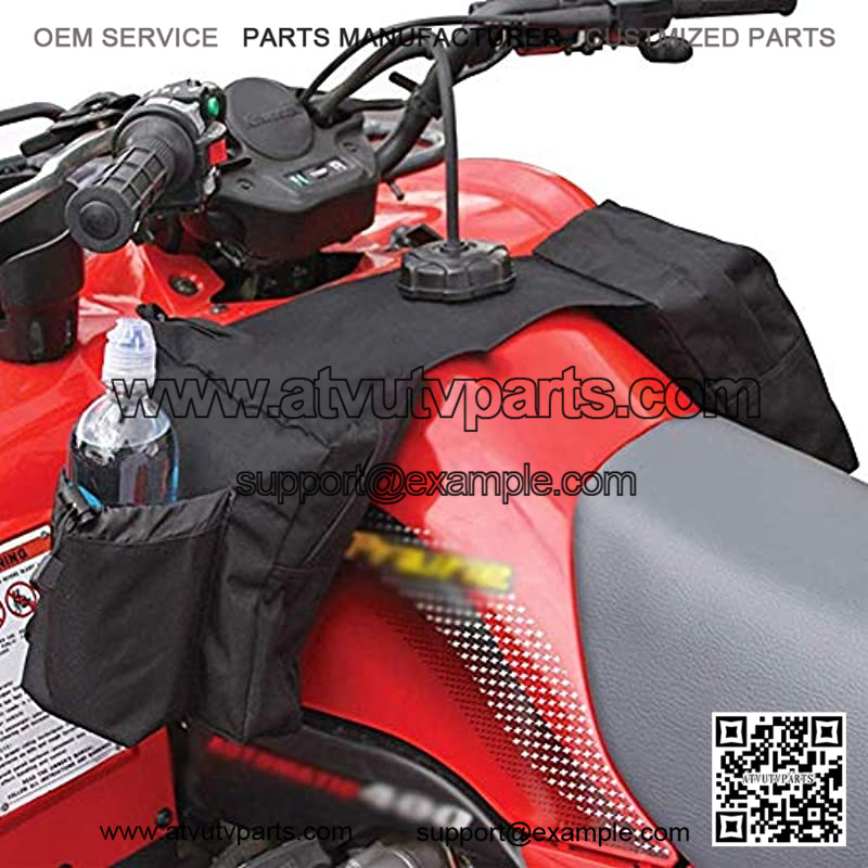 ATV tank bag Dual zippered pockets (one each side). An insulated exterior pocket on one compartment holds a 1 litre water bottle with toggle drawstring to keep it in place.