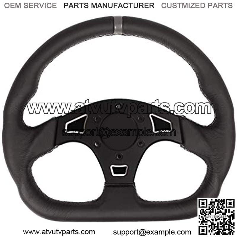 “The Ballistic “D” steering wheel kit provides high performance styling and driving comfort for your UTV! Contoured for comfort and crafted with genuine leather, the Ballistic D Steering Wheel adds extra knee clearance. It also has sport grips at 10 & 2, ensuring a positive hold when things get bumpy! The steering wheel features black leather with grey stitching and a grey leather centering strip at the top, the center accents consists of 2 plates, a raw or powder coated base plate and anodized aluminum top plate with logo laser engraved in the center recess. These steering wheels have superior rigidity and strength compared to the stock wheels. The Ballistic “D” Steering Wheel requires an adapter hub to be mounted on all UTV’s. It is compatible with other aftermarket 6-bolt hubs and the RZR XP Turbo S’ stock hub.El kit de “D” de proporciona un estilo de alto rendimiento y comodidad de conduccin para tu UTV! Contorneado para mayor comodidad y fabricado con cuero genuino, el Ballistic D a ade espacio extra para la rodilla. Tambin tiene pu os deportivos en 10 y 2, asegurando una sujecin positiva cuando las cosas se vuelven baches. El cuenta con cuero negro con costuras grises y una tira centrada de cuero gris en la parte superior, los acentos centrales consisten en 2 placas, una placa base revestida o en polvo y una placa superior de aluminio anodizado con el logotipo de grabado con lser en el hueco central. Estos volantes tienen una rigidez y resistencia superiores en comparacin con las ruedas de stock. El balstico “D” requiere un cubo adaptador para ser montado en todos los UTV’s. Es compatible con otros bujes de 6 pernos del mercado de accesorios y el cubo de stock RZR XP Turbo S.”