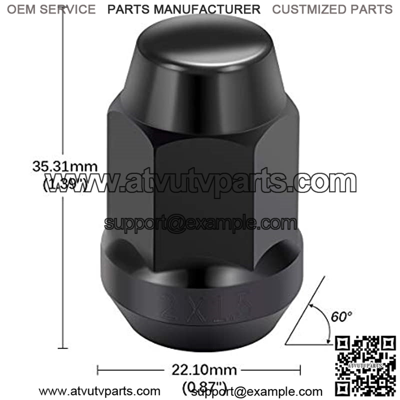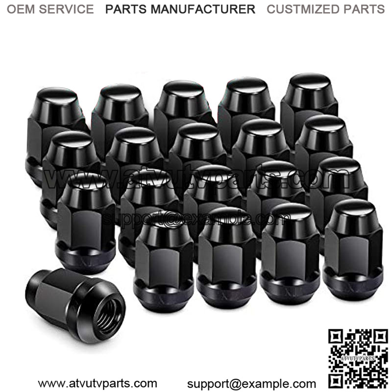 Thread Size: M12x1.50 Package Quantity: 20Overall Length:1.39″(35.31mm) Overall Diameter:0.87″(22.01mm) Seat Type: ConicalStyle: HexagonColor:Black Hex Size: 3/4″ (19mm)