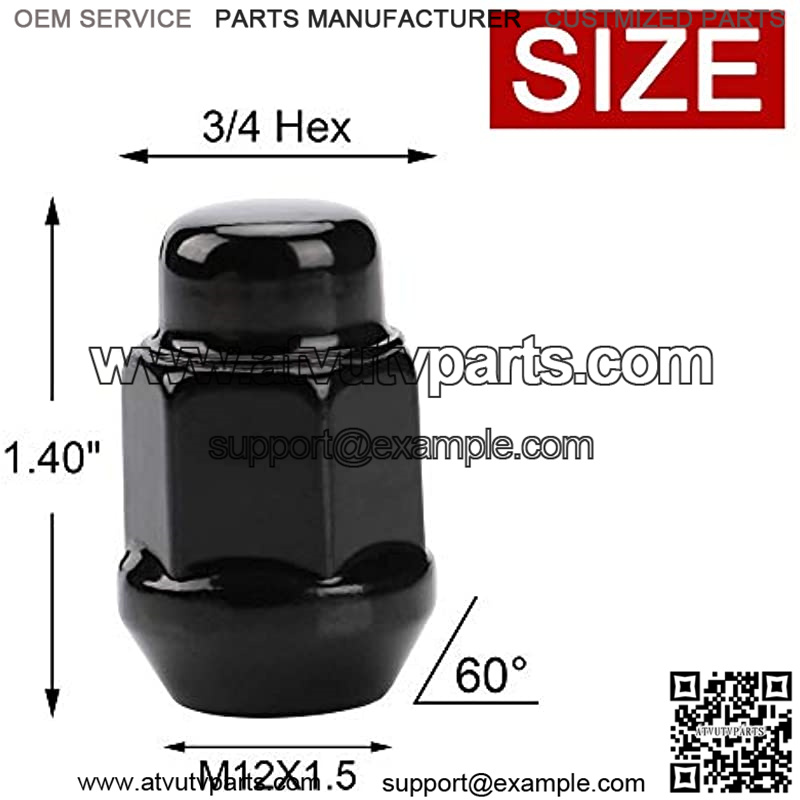 Specifications: M12x1.50 thread – Closed End Bulge Acorn Style Lug Nuts – Conical 60 Degree Seat – 3/4(19mm) hex – 1.4 inch(35.56mm) long – 22.1mm wide.