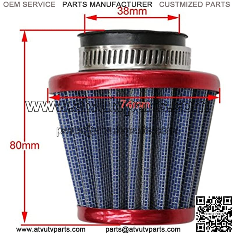 50Cc 70Cc 90Cc 110Cc 125Cc 150Cc 200Cc Atv Dirt Bike Pit Bike Scooter Moped Go Kart Air FilterScooter Go Kart Air Filter Cleaner, catch impurities in air to prolong the engine life Conical style with dual layer steel mesh design; Material: Steel with rubber connectorInside diameter: 38mm(1.5 inch); Overall height: 3.1″(80mm) ; Outside diameter at widest point: 2.9″(74mm)