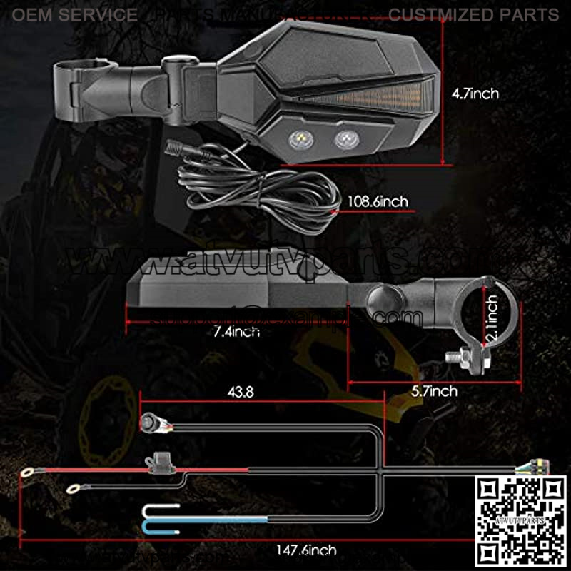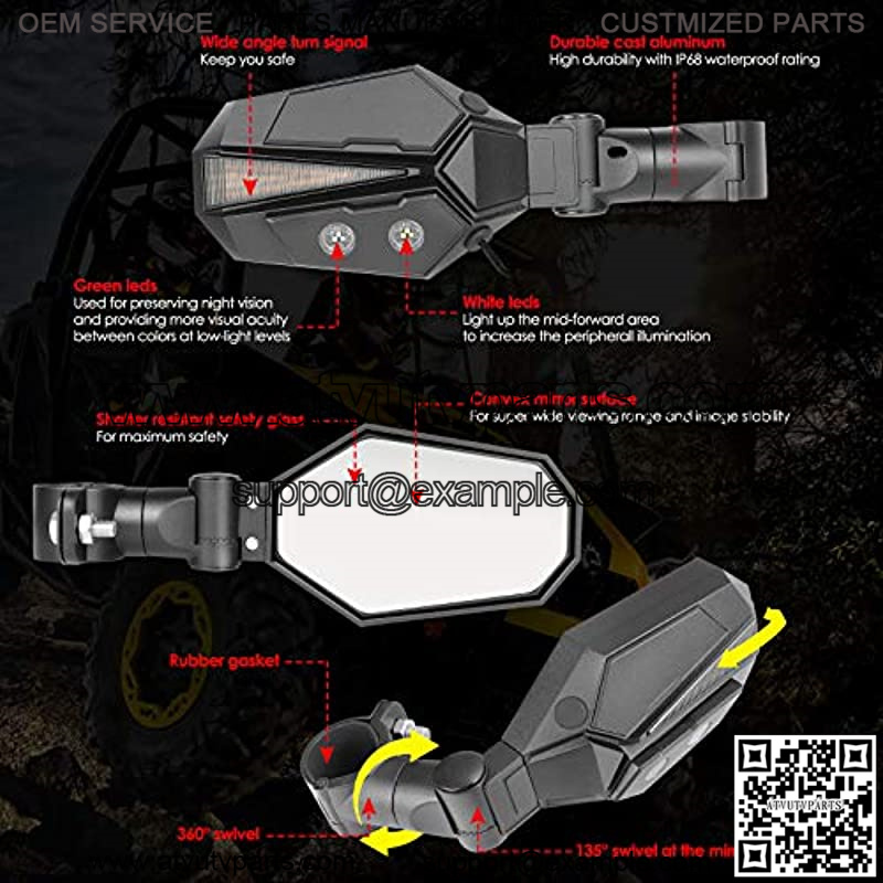UTV sideview lighted mirror kit is a perfect combination with lights and mirrors. Lights to see everything ahead, mirrors to see everything behind. It can meet all you need and even you maybe need!