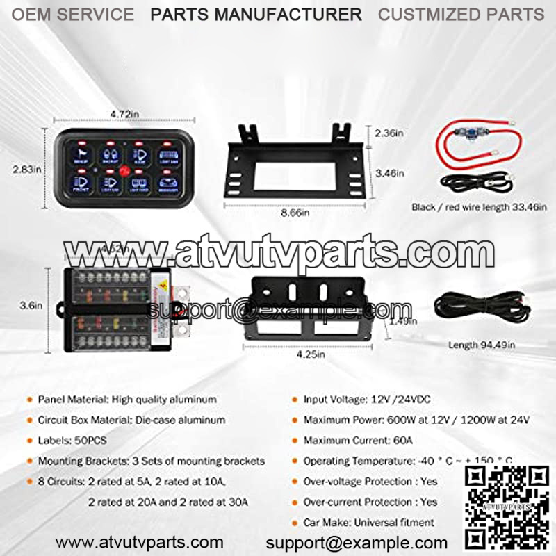 8 GANG SWITCH PANEL SPEC – Operating voltage: 12-24V DC; Max power rating: 1200W. Max current rating: 60A. The 8 gang switch panel offers a perfect solution for wiring and operating your electronic accessories with 8 gang switch panel automatic dimmable, so you can fully operate your vehicle’s lighting, accessories, and electronic equipments.