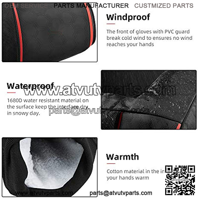 Keep Your Hands Warm and Dry The front has a plastic guard to break cold wind that ensures no wind reaches your hands. 1680D Water resistant material on the surface and cotton material in the interior keep your hands warm and dry.