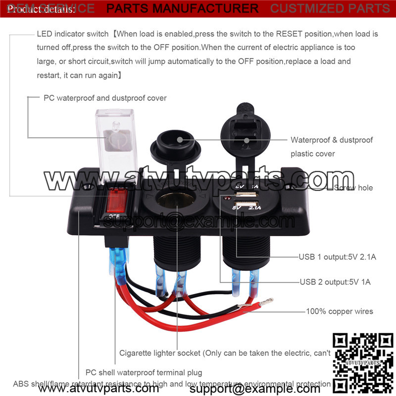 Product function: The switch has overload, short circuit and undervoltage protection functions, and has the ability to protect the circuit and power supply; the cigarette lighter holder can be used to obtain electricity; USB can supply power to devices such as mobile phones and tablets