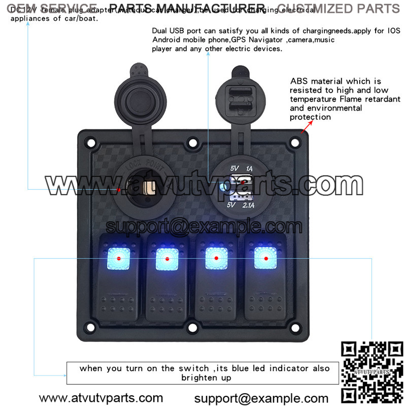 Product use: It can be used as headlight switch, fog light switch, wide-view light switch, car refrigerator switch, car vacuum cleaner switch, car external equipment to get power, and power for mobile phones, tablets, etc.
