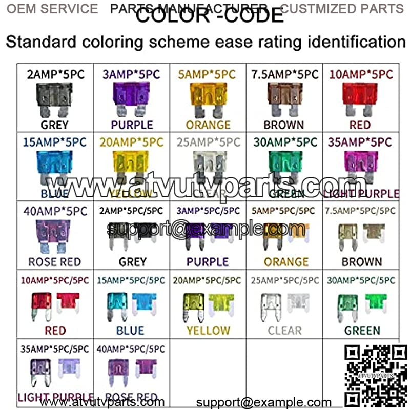5PCS Standard Fuse5PCS x 2 Amp (Grey) -5PCS x 3 Amp (Purple) -5PCS x 5 Amp (Orange) -5PCS x 7.5 Amp (Brown) -5PCS x 10 Amp (Red) -5PCS x 15 Amp (Blue)-5PCS x 20 Amp (Yellow) -5PCS x 25 Amp (Clear) -5PCS x 30 Amp (Green) -5PCS x 35 Amp (Light purple) -5PCS x 40 Amp (Ros purple)-5PCS x 40 Amp (Rose red)5PCS Mini Fuse5PCS x 2 Amp (Grey) -5PCS x 3 Amp (Purple) -5PCS x 5 Amp (Orange) -5PCS x 7.5 Amp (Brown) -5PCS x 10 Amp (Red) -5PCS x 15 Amp (Blue)-5PCS x 20 Amp (Yellow) -5PCS x 25 Amp (Clear) -5PCS x 30 Amp (Green) -5PCS x 35 Amp (Light purple) -5PCS x 40 Amp (Ros purple)-5PCS x 40 Amp (Rose red)5PCS Low Profile Mini Fuse5PCS x 2 Amp (Grey) -5PCS x 3 Amp (Purple) -5PCS x 5 Amp (Orange) -5PCS x 7.5 Amp (Brown) -5PCS x 10 Amp (Red) -5PCS x 15 Amp (Blue)-5PCS x 20 Amp (Yellow) -5PCS x 25 Amp (Clear) -5PCS x 30 Amp (Green) -5PCS x 35 Amp (Light purple) -5PCS x 40 Amp (Ros purple)-5PCS x 40 Amp (Rose red)