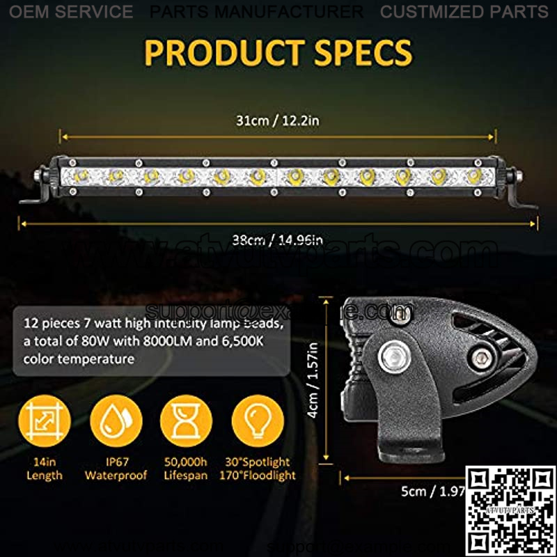 Wide Application 14in work light bar coming with two adjustable brackets,you can control the angle as you need,it fit for all vehicle with DC9-30V(Truck, Car, Motorcycle, SUV, ATV, Boat),suitable for travel,home lighting,adventure and transportation.