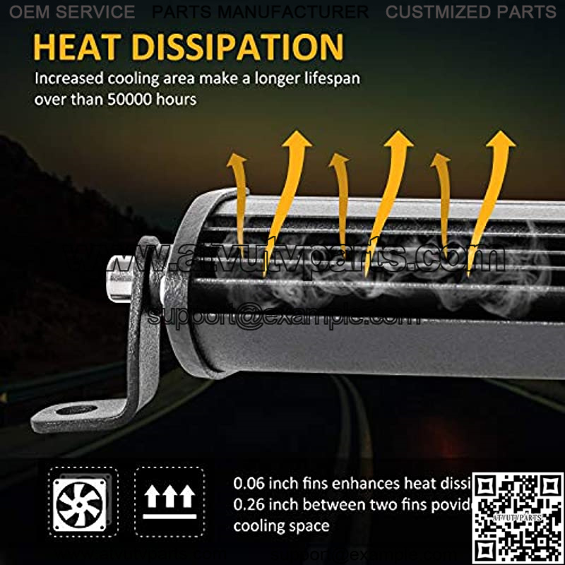 Effective Heat DissipationThe 0.06 inch fan enhances heat dissipation and the spacing between the two fans is 0.26 inch,which providing enough cooling space,increased cooling area make this 14in driving light bar has a longer lifespan over than 50000 hours.