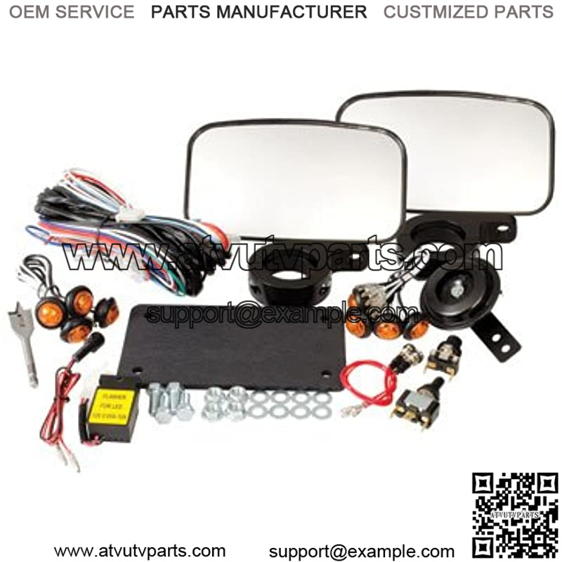 The UTV Horn & Signal Kit is designed to be a simple way to provide front and rear turn signals, horn, license mount, and rearview mirror for your UTV. This kit is easy to install with a few common tools. The components have universal applications and will work on almost any UTV. Kit comes complete with wiring harness, LED front and rear turn signals, flasher relay, horn, mirrors, license mount, horn button, and blinker switch.