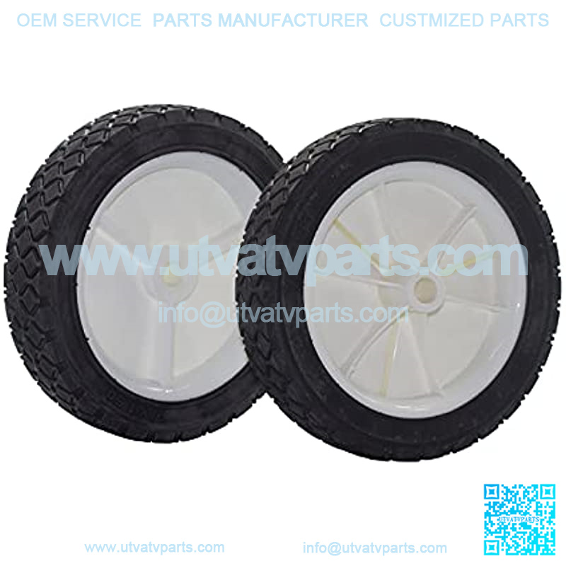 Replaces 72-107 / 9611 SIZE5-inch plastic rim with 1-1/2-inch offset hub and 1/2-inch bore 1-1/2-inch wide X 7-inch diameter semi-pneumatic rubber tire with diamond tread 60-lb load capacity USAGEThese tires are for hand trucks, lawnmowers, utility carts, and other lawn and garden equipment Semi-pneumatic tires are light weight, puncture proof, and provide cushioning. They are designed to not pull away from their rim under use. PACKAGESet of 2 wheels