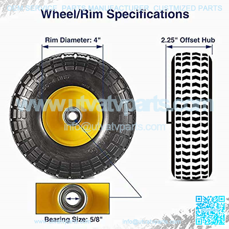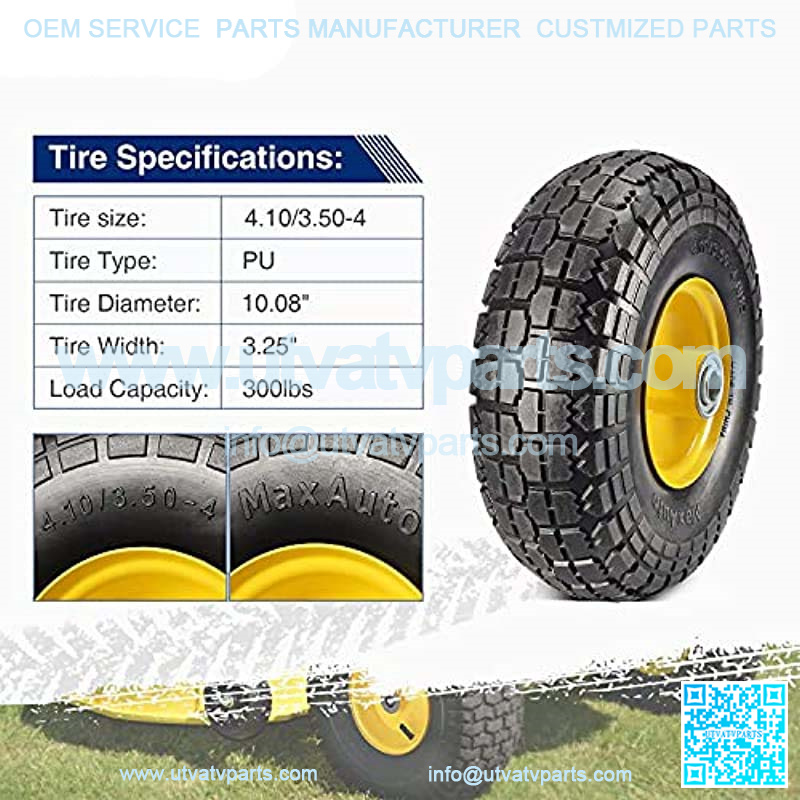 Tire size:4.10/3.50-4;Tire Type:PU;Tire Diameter inch:10.08″;Tire Width inch:3.25″;Load Capacity:300lbs