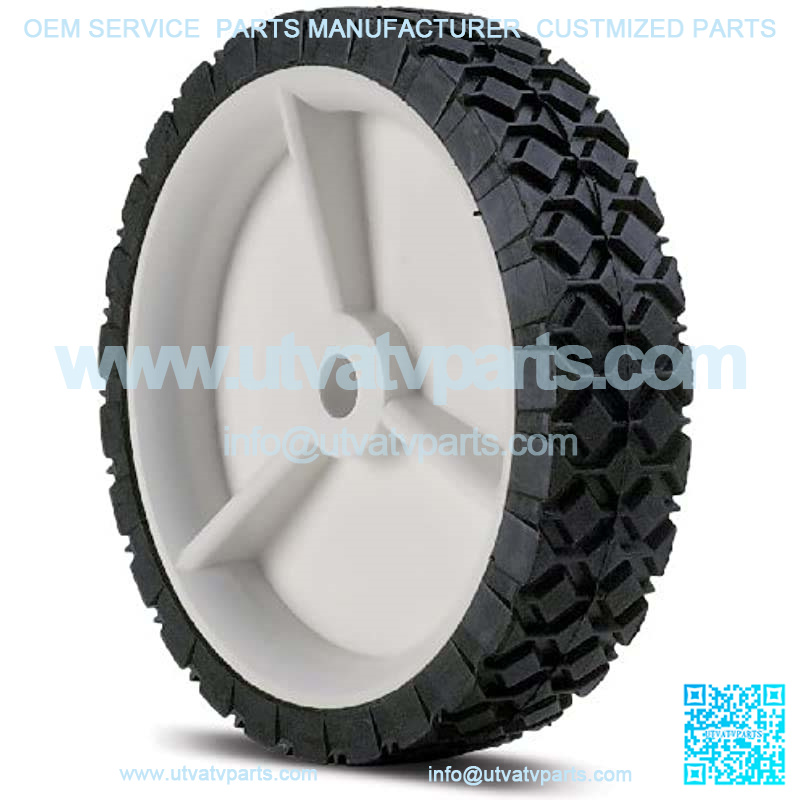 This wheel is 8 x 175, has diamond tread design and an offset, plastic hub.