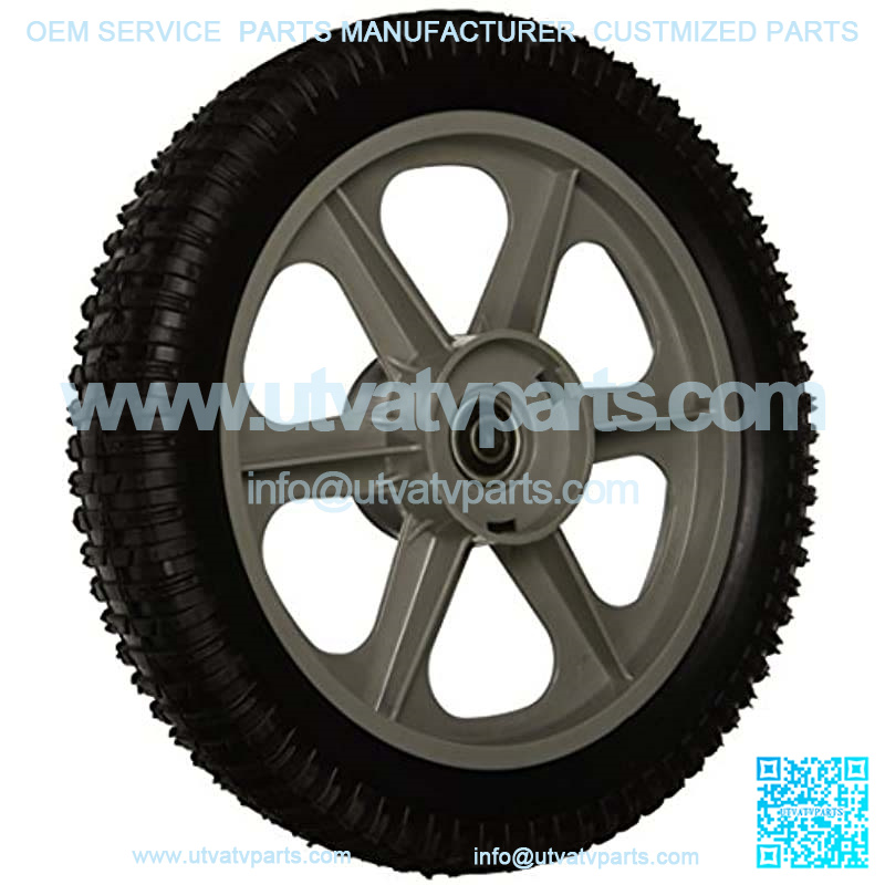 12 Inch x 2 Inch Plastic Spoked Wheel. Used on many Poulan// high-wheeled mowers. This wheel has a 1-3/4″ Hub and a lug tread.