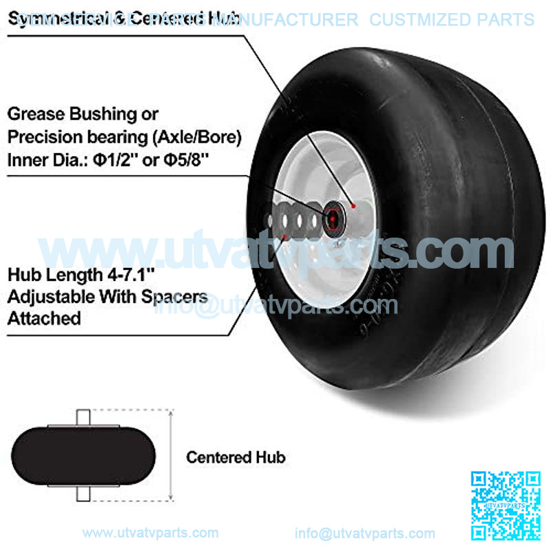 Dimensions: tire diameter: 12.8″; tire width: 6.2″; rim diameter: 6″; hub length 4-7.1″ (adjustable); axle: 5/8″ or 1/2″ (grease bushing). Before ordering, please confirm all dimensions (tire size, hub length and axle) and grades on your device.
