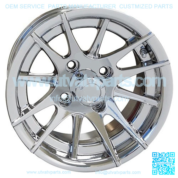 12″ Golf Cart Rim, 12 Spoke, Chrome Wheel & Center Cap, 12×6 Centered Specially designed for golf car use. Eliminates water sling and fender rubbing. Fits inside wheel wells. Aluminum wheels include center caps. Lug nuts sold separately. PRODUCT INCLUDES 1 RIM.