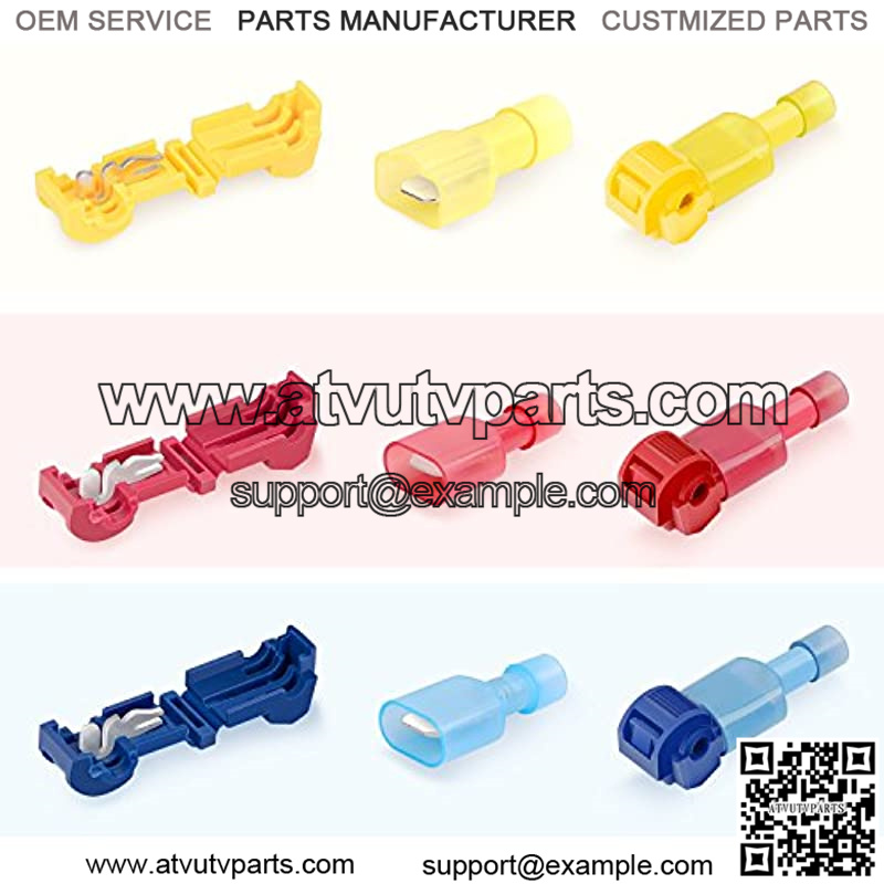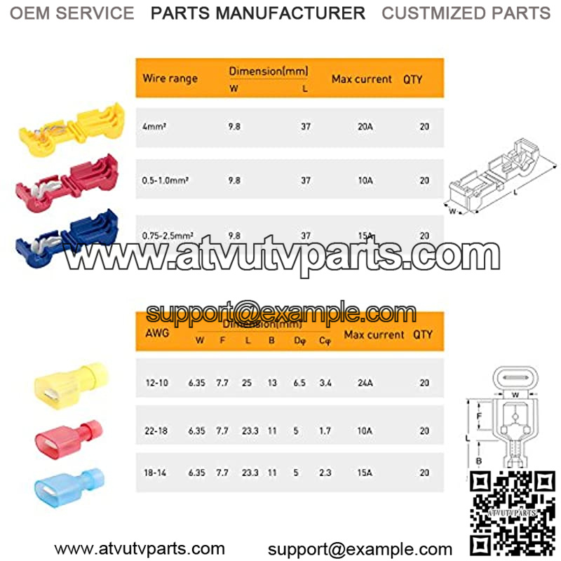Product Includes: 60 X T-Tap Wire Terminals (Red:20piece, Blue:20piece, Yellow:20piece ) Red: AWG 22-18; Wire range: 0.5-1.0mm; Blue: AWG 18-14; Wire range: 0.75-2.5mm; Yellow: AWG 12-10; Wire range: 4.0mm; 60 X Male Spade Connector (Red:20piece, Blue:20piece, Yellow:20piece ) Red: AWG 22-18; Wire range: 0.5-1.0mm; Blue: AWG 18-14; Wire range: 0.75-2.5mm; Yellow: AWG 12-10; Wire range: 4.0mm; Material: Copper + Nylon Max Ambient Temperature: 106??.