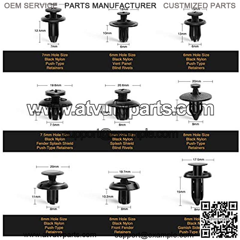 [0. 236??hole size; head dia: 15mm?Cstem length: 13mm-Nylon push type retainers-Qty: 14] [0. 236??hole size; head dia: 18mm?Cstem length: 10mm-Nylon vent panel blind rivets-Qty: 14] [0. 275″hole size; head dia: 16mm?Cstem length: 12. 5mm-Nylon push type retainers-Qty: 14] [0. 295″hole size; head dia: 19. 6mm?Cstem length: 9. 5mm?CFender splash shield push type retainer-Qty: 14] [0. 314″hole size; head dia: 20. 6mm?Cstem length: 9. 2mm?CSplash shield blind rivets-Qty: 10] [0. 314″hole size; head dia: 20mm?Cstem length: 10mm-Nylon push type retainers-Qty: 10] [0. 314″hole size; head dia: 20mm?Cstem length: 11mm?CNylon push type retainers-Qty: 10] [0. 314″hole size; head dia: 19. 7mm?Cstem length: 10. 2mm?CNylon front fender retainers-Qty: 10] [0. 314″hole size; head dia: 17. 5mm?Cstem length: 15mm?CGarnish side protector push type retainers-Qty: 10] [0. 314″hole size; head dia: 18mm?Cstem length: 22mm?CNylon push type retainers-Qty: 10] [0. 314″hole size; head dia: 20. 5mm?Cstem length: 20. 5mm?CNylon push type retainers-Qty: 10] [0. 334″hole size; head dia: 18mm?Cstem length: 13mm?CNylon push type retainers-Qty: 10] [0. 393″hole size; head dia: 20mm?Cstem length: 14mm?CNylon push type retainers-Qty: 10] [0. 393″hole size; head dia: 20mm?Cstem length: 13mm?CFront bumper push type retainers-Qty: 10] [0. 393″hole size; head dia: 20mm?Cstem length: 18mm?CFront head dia: 20mm?Cstem length: 23mm?CNylon bumper fascia retainers-Qty: 8] [0. 393″hole size; head dia: 20mm?Cstem length: 25mm?CNylon bumper retainers-Qty: 8] [0. 393″hole size; head dia: 20mm?Cstem length: 28mm?CNylon bumper fascia retainers-Qty: 8]