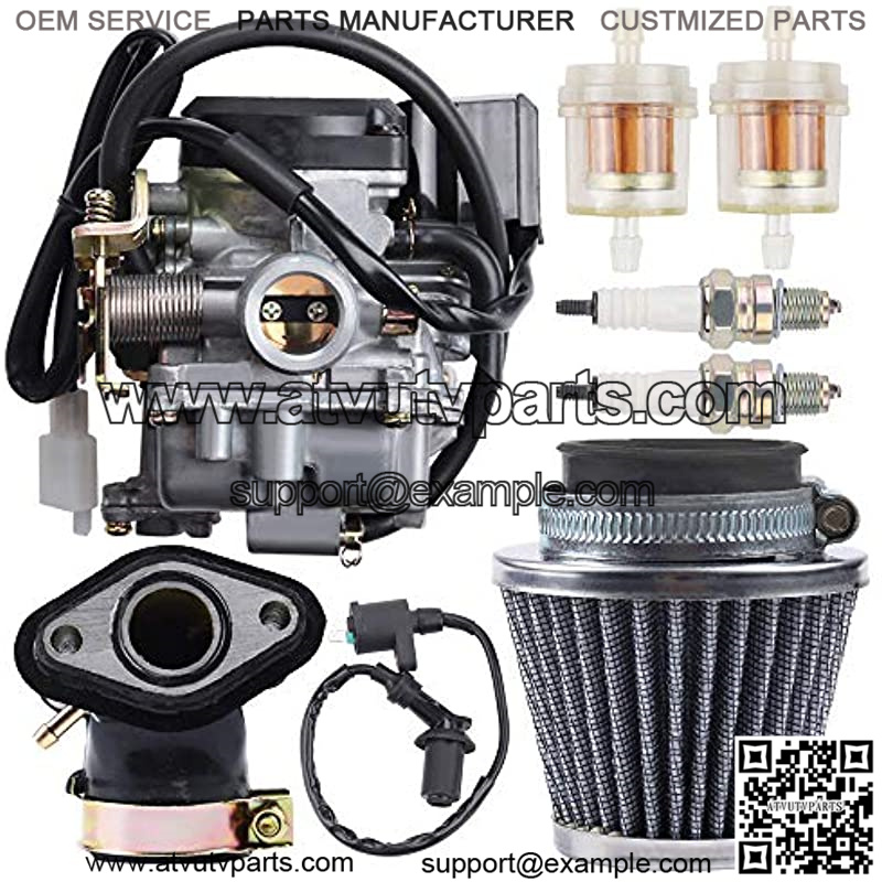 Package include: 1x carburetor + 2x fuel filter + 2x spark plug + 1x intake mainfold + 1x air filter + 1x ignition coil