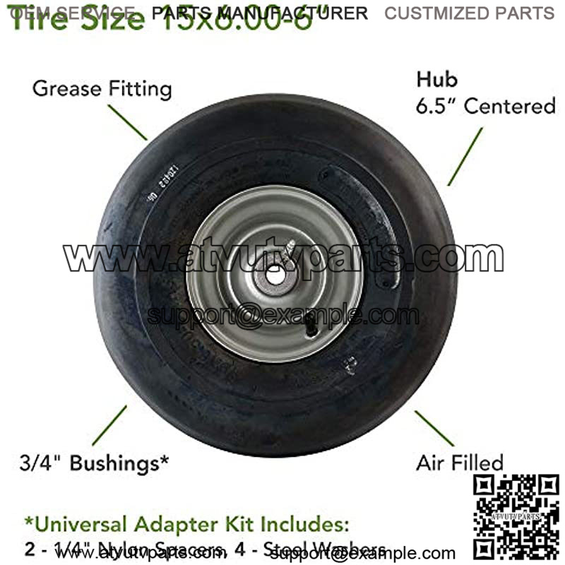 Universal fit 15×6 00-6 air-filled (pneumatic) lawnmower tire. Comes standard with a 6.5″ centered hub & 3/4″ sintered iron bushings. Smooth tread. Includes adapter kit to accommodate alternative hub lengths.