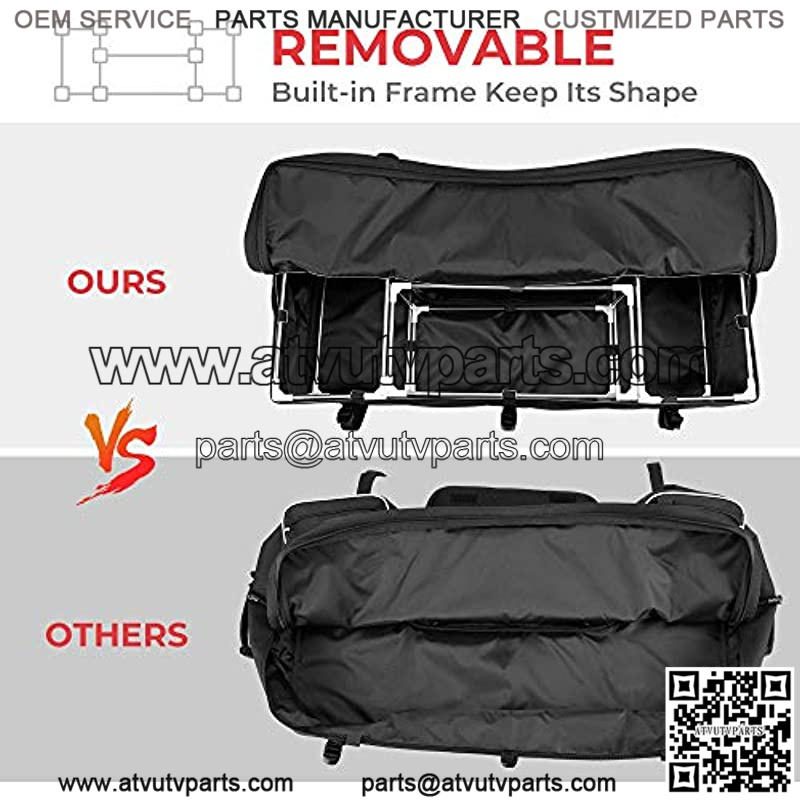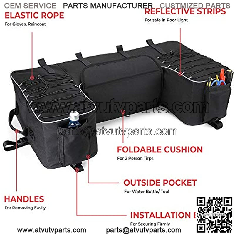 More StorageOur atv rear bags have high capacity. Elastic straps and self-fastening straps are adjustable for storing a variety of long items and make it easy to be picked up. And you can put some drinks or tools in this two pockets. (Diameter<3.5 Inch) Shaped and Convenient The three internal shelves not only support atv cargo bags but also can be detachable and portable when you don't need to use this bag. Two grab handles on the left and right side of the bag which help in the loading and unloading of the bag from your ATVs. Comfortable and StableComfortable and breathable cushion makes your partner more enjoyable during the trips and you can pack it up to the bag by using self-fastening straps. The Reflective strips on seams are great at night for the people following. Seven adjustable attachment straps make a universal fit and they will be securely fastened to the saddle once installed. Universally compatible with Sportsman Rancher Foreman Scrambler Kodiak Grizzly and so on. Upgraded Water-Proof Zipper Opening the full-protective cover will help you use the zipper much easily without jam. SBS waterproof zipper with strong airtightness needs you to clean the dust and dirt inside daily to effectively avoid the interference of opening the zipper. If your ATV seat bag is often used in a humid environment, lubricant will be a good method to maintain the normal usage of the SBS waterproof zipper, effectively protecting it from rust and extending the service life.