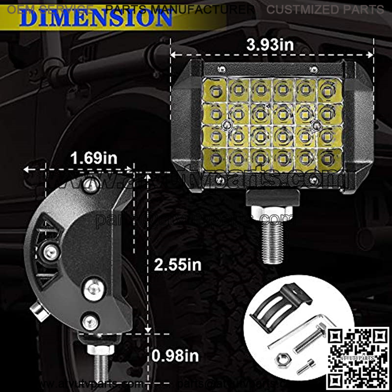 PACKAGE: 2PCS 4” 72W LED light pods,universal mounting bracket,Mounting Kits,Provide 2 years warranty.If you have any questions please contact our by email, we answer online 24 hours.
