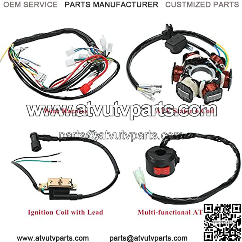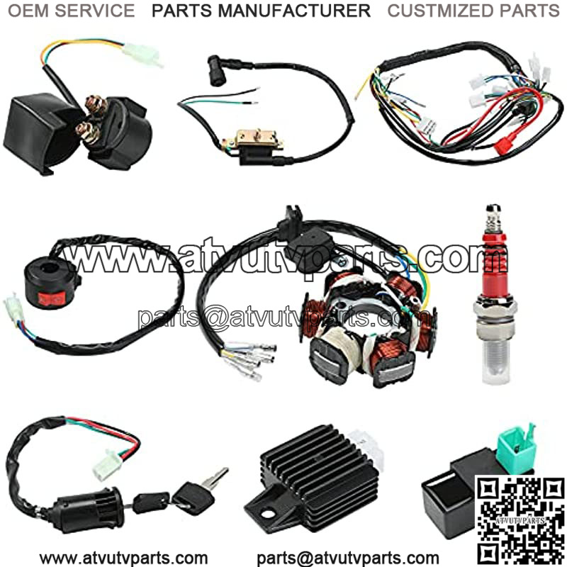 COMPLETE WIRING HARNESS KIT- This is a complete electric ATV wiring harness parts kit, package includes: 1x ATV wiring harness, 1x ATV Stator 6 Coil, 1x CDI(5Pin AC), 1x Ignition Switch, 1x Upgraded Multi-functional ATV Switch, 1x Spark Plug, 1x Rectifier, 1x Ignition Coil with Lead, 1x Solenoid Relay.