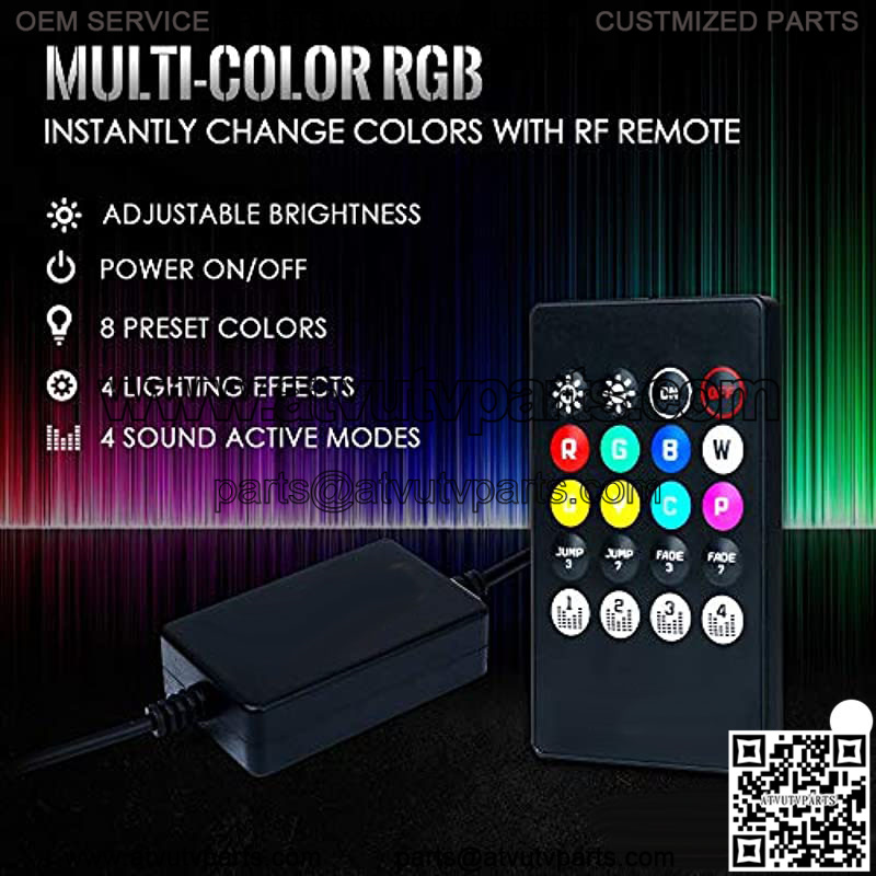 MULTI-COLOR FUNCTIONThis Lighting Kits have 8 Preset Static Colors. 4 Lighting Effects: 2 Preset Jump and 2 Preset Fading Patterns. 4 Sound Active modes, LEDs change according to Sound. Pre-Applied Adhesive Tape.
