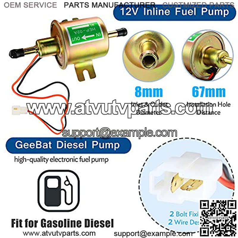 Electric Fuel PumpMaterial: Copper Clad Aluminum; Voltage: 12V; Current: 2A; Output Pressure is 3-6 psi, which can reach 80-100 (liters/hour) per hour, and the oil absorption capacity is strong enough to ensure the supply of fuel.