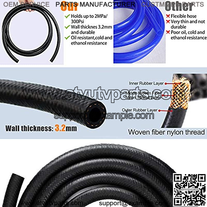 3-Layer Thickened Fuel LineThe fuel line is made of 3-layers: inner pipe, outer pipe and extra reinforcement layer. The inner and the outer pipe are made of rubber and the middle reinforcing layer is a woven fiber nylon thread. The wall thickness is 3.2mm. Oil resistant, cold-resistant and ethanol tolerance. 6.5 Foot / 2m hose can be cut to size for all your applications.