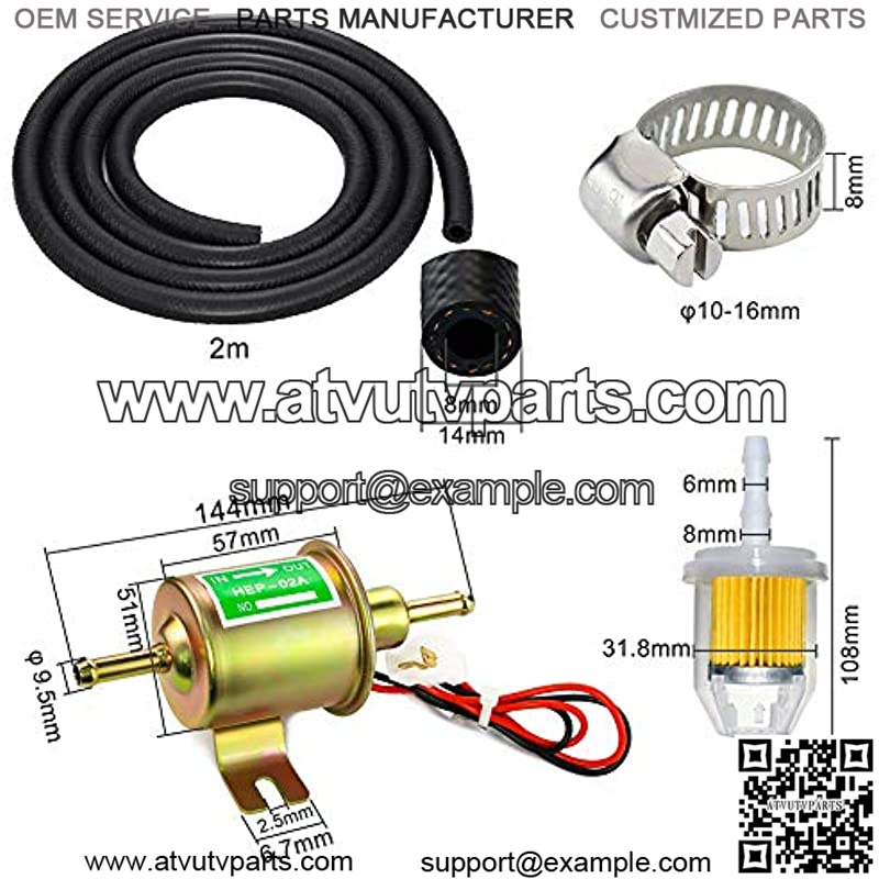 Universal Electric Fuel Pump Kit for Carburetor Lawn Mower, DC 12V (3-6PSI) Electric Fuel Pump + 2 Meter/6.56-Foot 5/16″ ID Fuel Line + Fuel Filters + 10pcs Hose Clamp